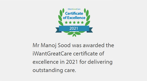 He is proud to have been awarded both the iWantGreatCare Certificate of Excellence in 2021 for delivering outstanding care and the Top Doctors Certificate of Excellence in 2020 for having the highest patient ratings. His has also been recognised by his NHS Trust by the award of 3 Clinical Excellence awards.