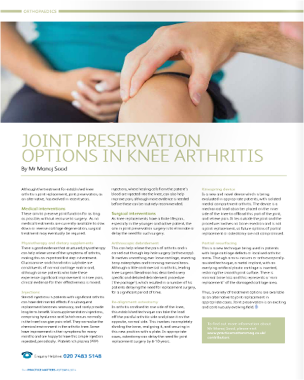 Mr Sood’s article in Practice Matters magazine describes the joint-preserving options that are available for people suffering from knee arthritis. This will be of interest to those patients who are keen to avoid or to delay knee replacement surgery but who wish to explore other pain relieving options.
